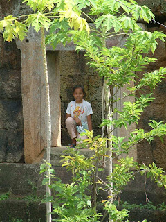 Coming back from the quicky mart. One of the fun things about this trip was; a lot of the trees had some sort of fruit on them. The girls where excited to find this vine in one of the fallen walls of the temple.