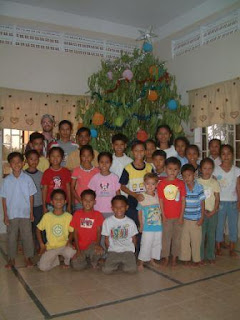 Our second CHRIST-mas tree, this one is a eucalyptus branch. We used balloons with candy inside and tinfoil with candy inside to decorate the tree.