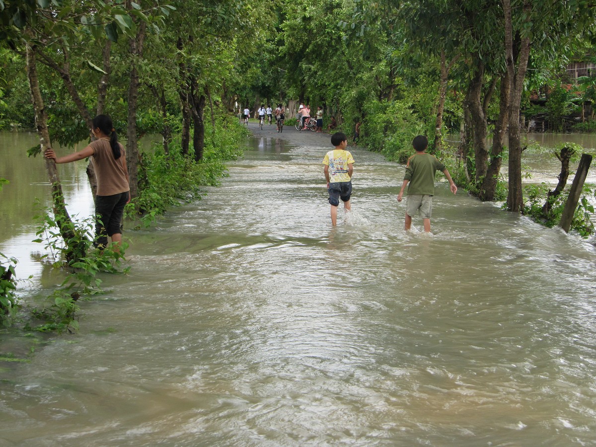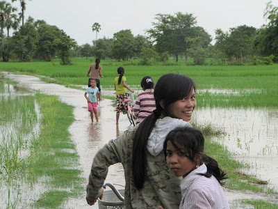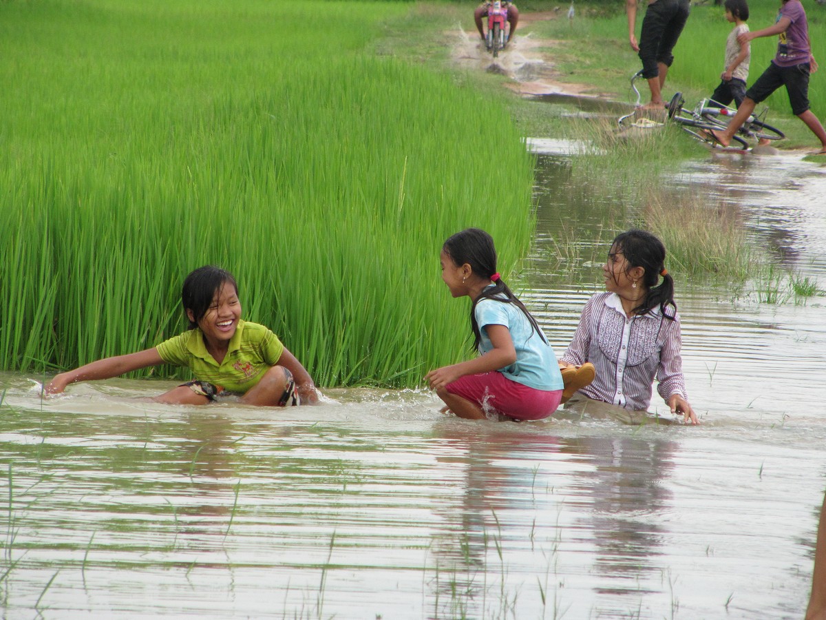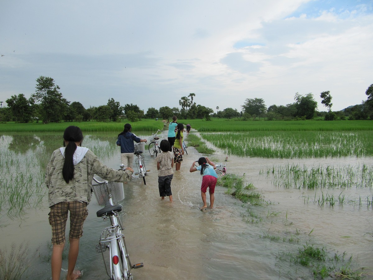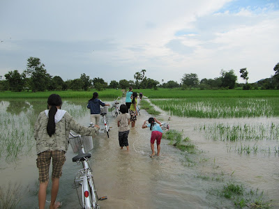 The road going to the school is covered with a rather swift current of water, maybe about a foot deep in the middle. The rice field on the right and left though are two and a half to 3 feet deep.