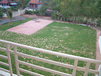 Part of the driveway on the left and the trees. The volleyball court and all the wonderful green grass. Donated by some friends Australia. There is sand on top to reduce the mud. It will grow through for a prettier picture.