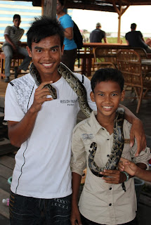 This little man is famous I have seen him in many pictures and now we get to met him our self.  He floats around in a wash tub with a boa constrictor snake trying to earn money from the tourist.