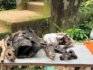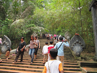 Lots of stairs lead up to the carved rock and had a lot of people worshiping idols.