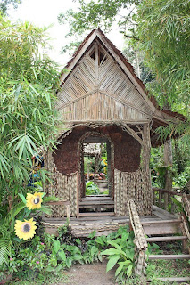 Finally we can hear water and we see a moss covered temple. It is lush and green every where