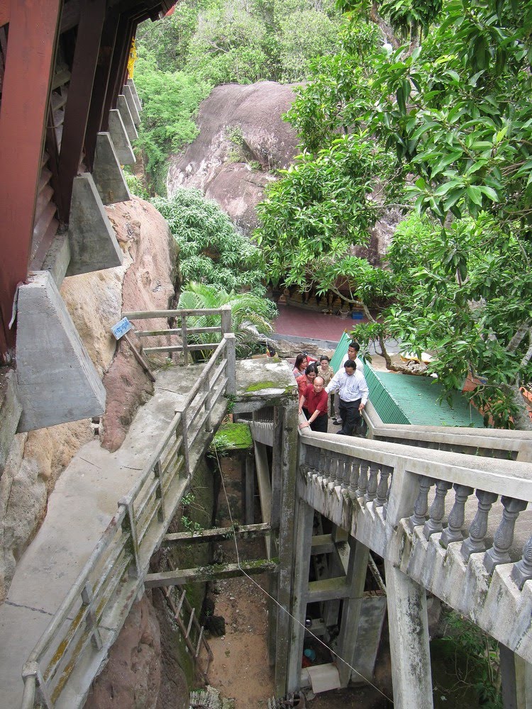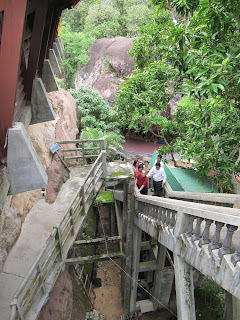 Lots of stairs lead up to the carved rock and had a lot of people worshiping idols.