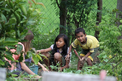 Looking for worms with Sarah, Rachana, and Nop.  Nop loves to be in the pictures.